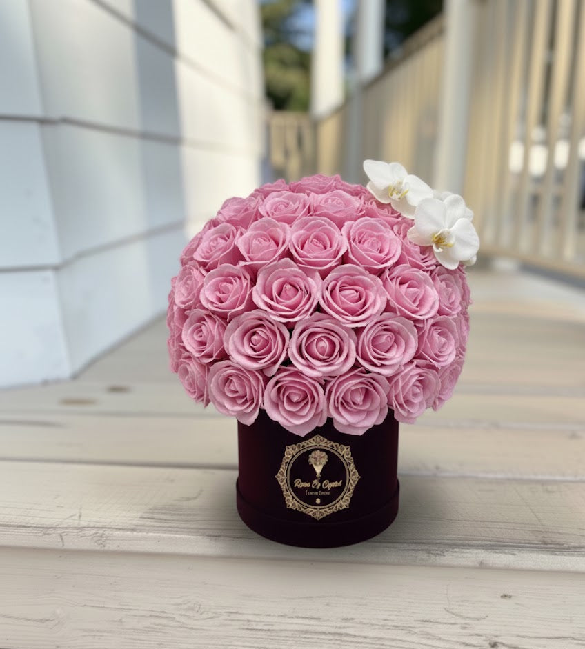 Amore Luxe Élite elevates our signature rose dome with a refined designer touch. This luxury boxed arrangement features premium roses arranged in a full dome, accented with three elegant reflexed tulips placed at the top corner for added movement, texture, and visual interest.